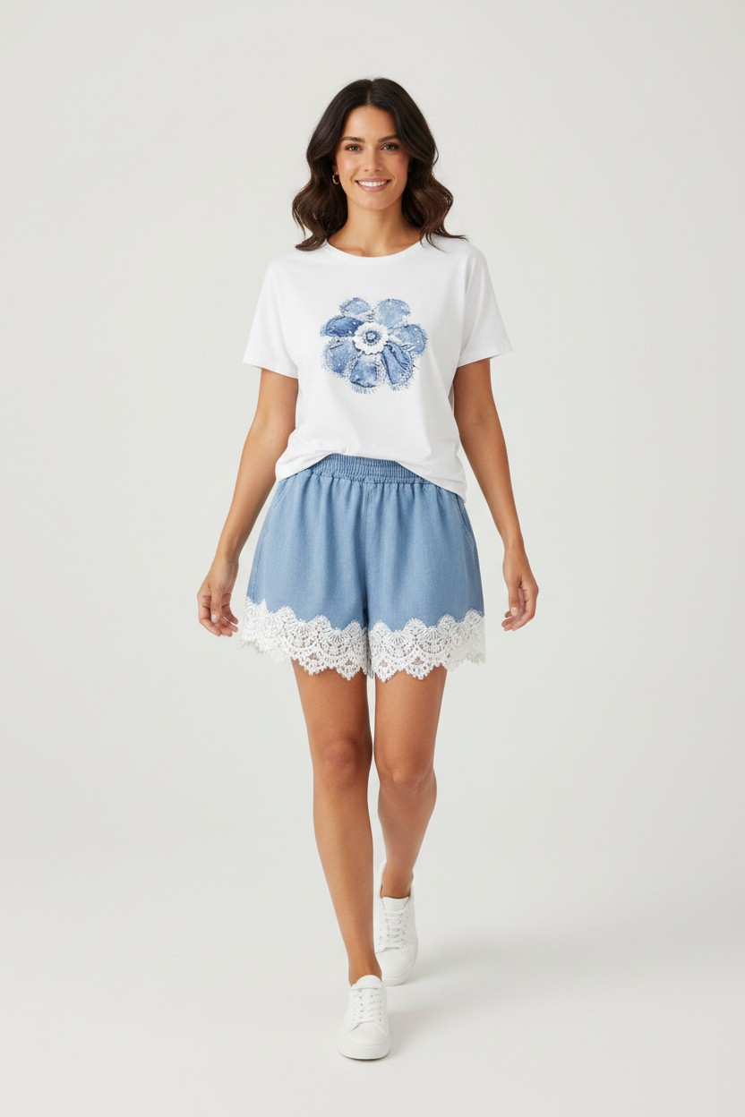 Dieses feminine 2-teilige Sommer Set kombiniert ein lässiges T-Shirt mit einer verspielten Shorts im Denim-Look. Die feinen Spitzen-Details machen den Look besonders zart und perfekt für warme Tage.